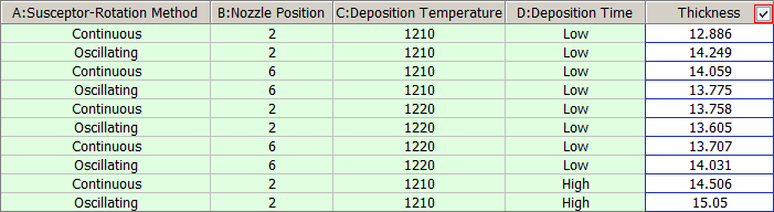 Factor Columns display the settings used for each factor in the run. By default, these columns are titled using the format "X: Factor Name," where X is the abbreviated name. If you have defined the units for the factor, that will also be displayed in the column header. Factor columns are shown in green by default.