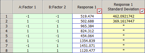 For each response that you select in this window, a standard deviation column will be inserted beside it on the Data tab, displaying the standard deviation of the observations taken for each factor setting combination across replicates. Such columns can be selected for inclusion in the analysis (i.e., used as responses).