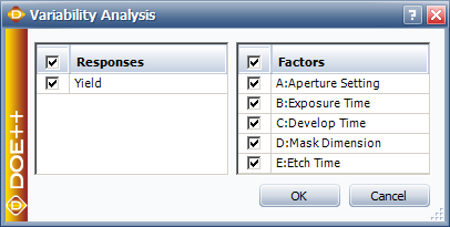 The Variability Analysis window allows you to select the response column(s) that you want to see variability analysis for and which factors to consider. To open the window, choose Data > Design > Variability Analysis or click the icon on the Data tab control panel.