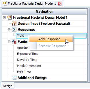 Before building your design, make sure you have the correct number of responses (i.e., the types of output that you want to measure) and that each response is defined appropriately. These settings are selected on the Design tab.