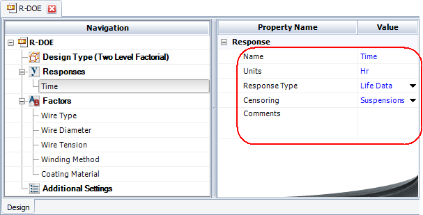 Response Type specifies whether you will be using life data (e.g., failure times) for the response values. If you select Life Data from the drop-down list, the data sheet will be configured for reliability DOE. Note that only one response in a given design can contain life data.