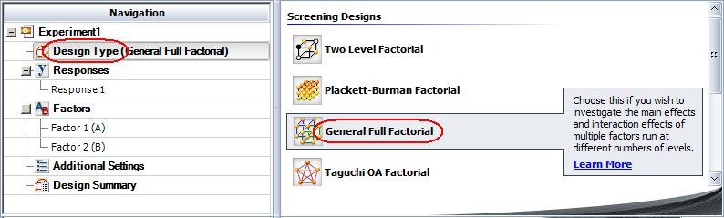 Click Design Type in the folio's navigation panel, and then select General Full Factorial in the input panel.