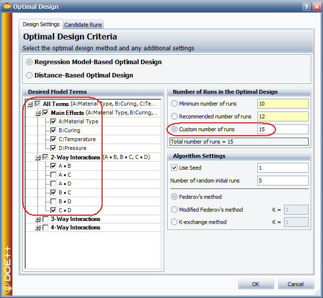 On the Design Settings tab of the window that appears, specify the terms that you are interested in investigating in the Desired Model Terms area. Also, in the Number of Runs in the Optimal Design area, specify how many runs you want to include in the design.