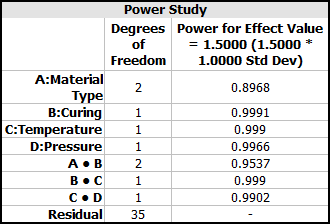 The power values for effect A and interaction AB are relatively small, which means the experiment is not likely to detect these effects if they are active. To increase the power, more runs need to be added to the experiment.