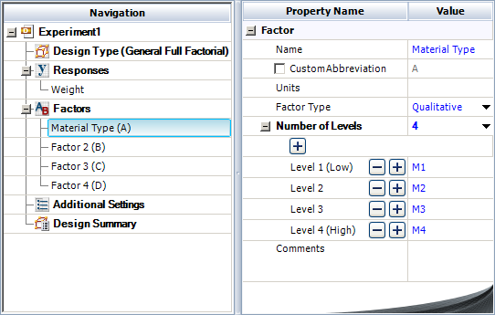 Define each factor by clicking it in the navigation panel and editing its properties in the input panel. The properties are given in the table above. The first factor is defined as shown next. (Note that the third and fourth factors are quantitative.)