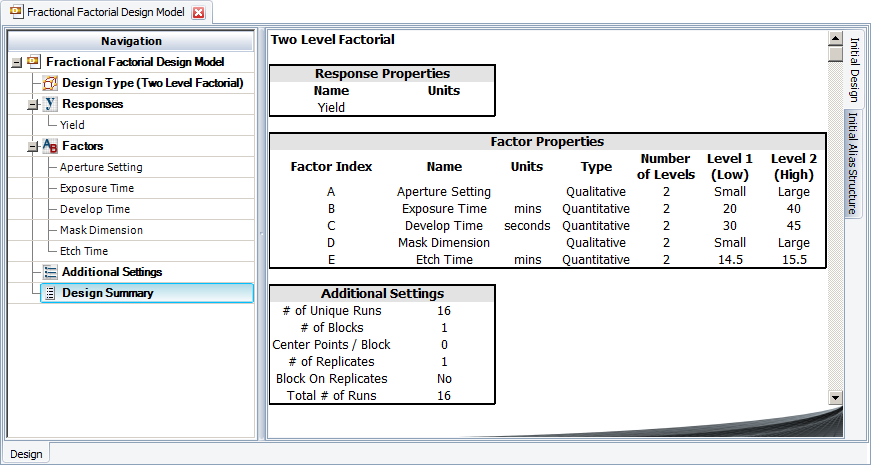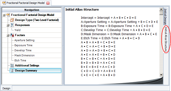 If you are using a two level factorial design with aliased factors (i.e., two level fractional factorial design), the summary will consist of two pages, accessed by clicking two tabs. The first tab will display the design properties summary and the second tab will display the initial alias structure, which describes which effects are indistinguishable from other effects in the current design. The alias structure is set automatically, but it can be changed by manually specifying generators.