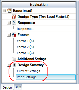 If no changes were made via the Data tab, then you can use the Prior Settings summary as a reference while you modify the settings on the Design tab. For example, if you want to undo some of the changes you've made to the Design tab settings since the experiment plan was built, you can compare the two summaries to see what has changed, or you can choose Design > Undo Changes to quickly bring the Design tab back in sync with the Data tab (i.e., the Design tab settings will once again accurately describe the built experiment).