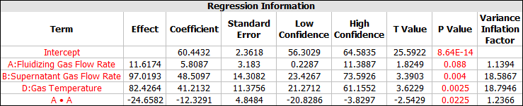 For the second response, the main effects of factors A, B and D were selected; the interaction effects AB and BD were selected; and the quadratic effects AA and DD were selected. Click the Calculate icon to analyze both responses.