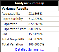 An analysis summary is shown when the current measurement data has been analyzed using the current settings. This area breaks down the amount of measurement variance due to repeatability, reproducibility and the measured part.