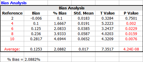 The bias values for each reference and the overall study can be seen by clicking the Detailed Summary link on the control panel. The results of the bias analysis are shown next.