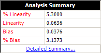 % Linearity is the percentage of increase of the process variation due to gage linearity. For example, a % Linearity of 5.3 means that the observed variation in measurements will be 5.3% greater than the variation of the parts themselves (i.e., the "true" process variation).