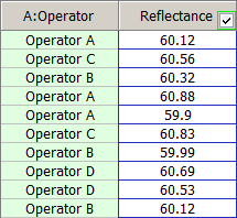 Factor levels can be displayed as the actual values assigned in the factor properties or as coded values. When you use coded values for one factor, general full factorial or Taguchi OA factorial designs, the lowest level will be displayed as 1, the next level as 2, and so on. To switch between coded and actual values, choose Data > Display > [Value Type].