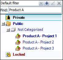 You can also search for projects by entering text in the Find field. The project list updates dynamically to show only the projects with names that contain the text that you have entered. As an example, the following picture shows a quick way to find all of the projects for a particular product line by using the project names instead of predefined categories or other filter criteria.