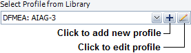Select Profile from Library displays a list of all profiles that have been defined in the active library. This is applicable only in Xfmea/RCM++/RBI. When you choose a profile from the list, all of the configurable settings for the project will be set/reset based on the settings that have been predefined for that profile. If you are editing a project, the current profile is shown in brackets. For users who are authorized to edit the active library, two additional icons will be enabled to the right of this drop-down list, as shown next.