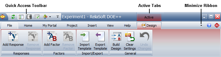 DOE++'s Ribbon includes the following tabs: