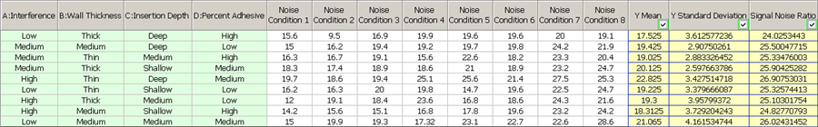 In analyzing the data set, DOE++ can calculate results for the Y Mean, Y Standard Deviation and Signal Noise Ratio columns. You will select one or more of these columns to be used as the "responses" for the analysis by selecting the check boxes in the column headers.