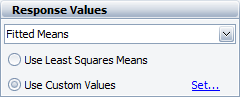 When a plot will calculate the mean response for a particular factor, the Set Custom Factor Values window allows you to specify the block value (if any) and values for other factors that will be used when calculating the response. It is accessed by clicking the Set link on the Analysis Plot control panel. This link is available in the Response Values area for plots that use fitted means to calculate the response value and use custom values for the other factors. (If the plot always uses fitted means, the drop-down list will not be available.)