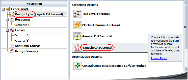 Click Design Type in the folio's navigation panel, and then select Taguchi OA Factorial in the input panel.
