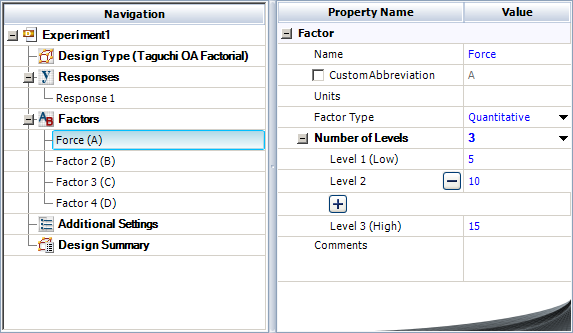 Define each factor by clicking it in the navigation panel and editing its properties in the input panel. The properties are given in the table above. The first factor is defined as shown next. (Note that every factor must be configured to have three levels.)