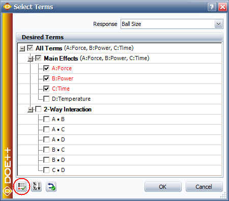 In the Select Terms window that appears, click the Select Significant Effects button to select only the significant effects to calculate the new model, as shown next, then click OK.