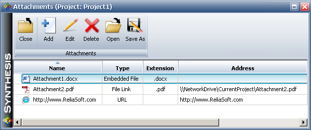 All Synthesis desktop applications support attachments at the project level. In all applications, project attachments can be displayed/managed from the Attachments icon in the Project Properties window.