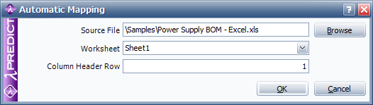 Click the Automatic Mapping icon. In the Automatic Mapping window, click the Browse button to search for the BOM file, and then use the information from Step 1 to populate the Worksheet and Column Header Row fields. If you are working with the example BOM file, choose Sheet1 and then enter 1 for the column header row, as shown in the following example. Click OK.