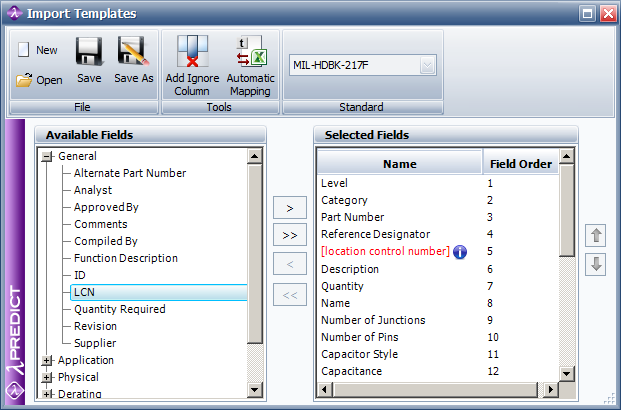 Create an import template by choosing Home > Templates > Import Templates. In the Import Templates window, use the Standard drop-down list to specify which prediction standard you want to associate with the template. The Available Fields area will display the properties used in the selected standard. (If you are creating a template from within the Import BOM Wizard, the standard type will already be selected.)