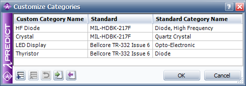 The Customize Categories window is used for importing "bill of materials" (BOM) files to Lambda Predict. It allows you to match the component categories used in your BOM file to the categories used in the selected prediction standard. For example, if the "Diode, High Frequency" component in the MIL-217 standard is referred to in your BOM file as "HF Diode," then you will need to tell Lambda Predict that these two categories are one and the same; otherwise, the component will be imported as an external component (i.e., a component that is not covered by the prediction standard and is therefore defined only by its failure rate).