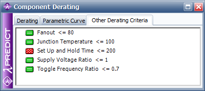 The following example shows the derating requirements of one particular component. In this case, the "Set Up and Hold Time" property of the component exceeds the derating requirement, which is less than or equal to 200 minutes. Therefore, that criteria shows a red icon next to it, indicating that the component is overstressed.