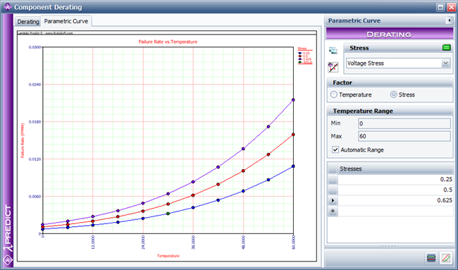 The following example shows a plot for a particular component. In this example, the analyst wishes to evaluate how the failure rate of the component varies over increasing temperatures, based on a particular voltage stress ratio. The Stresses table on the control panel shows the component's actual voltage stress ratio (0.25) and two other voltage stress ratios that the analyst wishes to consider (0.5 and 0.625). This puts three curves on the plot, one for each voltage stress ratio, plotted against temperature (x-axis) and the component's failure rate (y-axis).