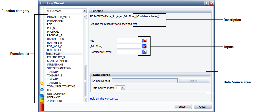 Select a function from the navigation panel and enter any required inputs. The following picture shows the most complex configuration as an example. After entering the inputs, click Insert to place the function into the report at the current cursor location. You can move and/or modify the function expression after it has been inserted.