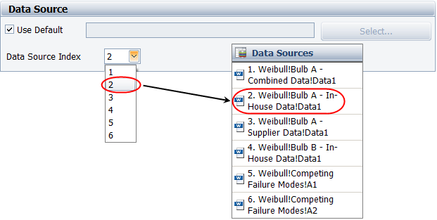 First, you must add data sources to the Synthesis Workbook (see Associated Data Sources). Then, in the Function Wizard, click the Data Source Index drop-down list and choose the index number of the desired data source. (In spreadsheets, select the Use Default check box to access the Data Source Index drop-down list.)
