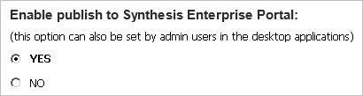 Some SEP-related features in Synthesis desktop applications (e.g., the ability to publish analysis summaries, workbooks, reports, etc.) will be visible only if the Enable publish to Synthesis Enterprise Portal option is set to "Yes" for the database.