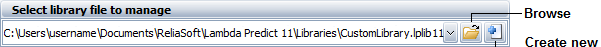 In the Manage Library window, the address bar at the top of the window shows the location and name of the last library file that was accessed. You can use the icons in the field to browse for a different file or create a new library file (*.lplib11), as shown in the following picture. You can also open a file from a previous version of Lambda Predict (*.lplib).