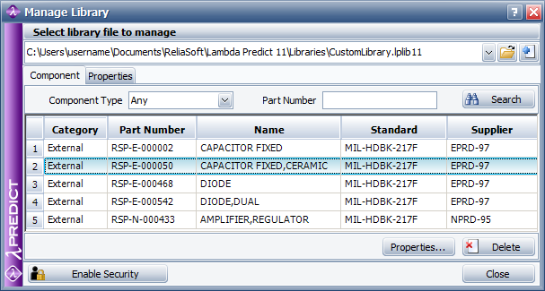 Note: Lambda Predict comes with two installed library files for your reference: PartsCount.lplib11, which is used for MIL-217 parts count predictions (see Using the Parts Count Method); and Library.lplib11, which contains component data that are available from your free access to PartLibraries.org (see Importing from PartLibraries.org). These two files are saved in the default documents folder for your computer (e.g., My Documents\ReliaSoft\Lambda Predict 11\Libraries).