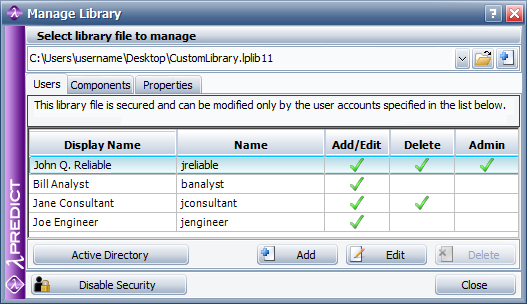 If you enable security, you can specify which user accounts can add/edit/delete component data from your library file. You can also give the role of Admin to other users. All other user accounts that do not have permissions for the file can still import component data from it so long as the file is saved in a location that they have read/write access to, but they will not be able to modify the contents of the file.
