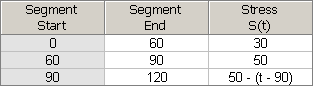 Stress S(t) is the stress value or function for the segment. If the stress level will stay constant during a segment, enter a constant value (e.g., 30). If the level will change during a segment, enter the value as a function of time (e.g., at time = 20, the function t + 20 will return a value of 40). When entering a function, you must use t or T as the time variable.