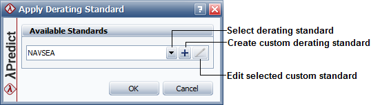From this window, you can also create or edit custom derating standards by clicking the Add or Edit icon in the window, as shown next. (See Creating Custom Derating Standards.)