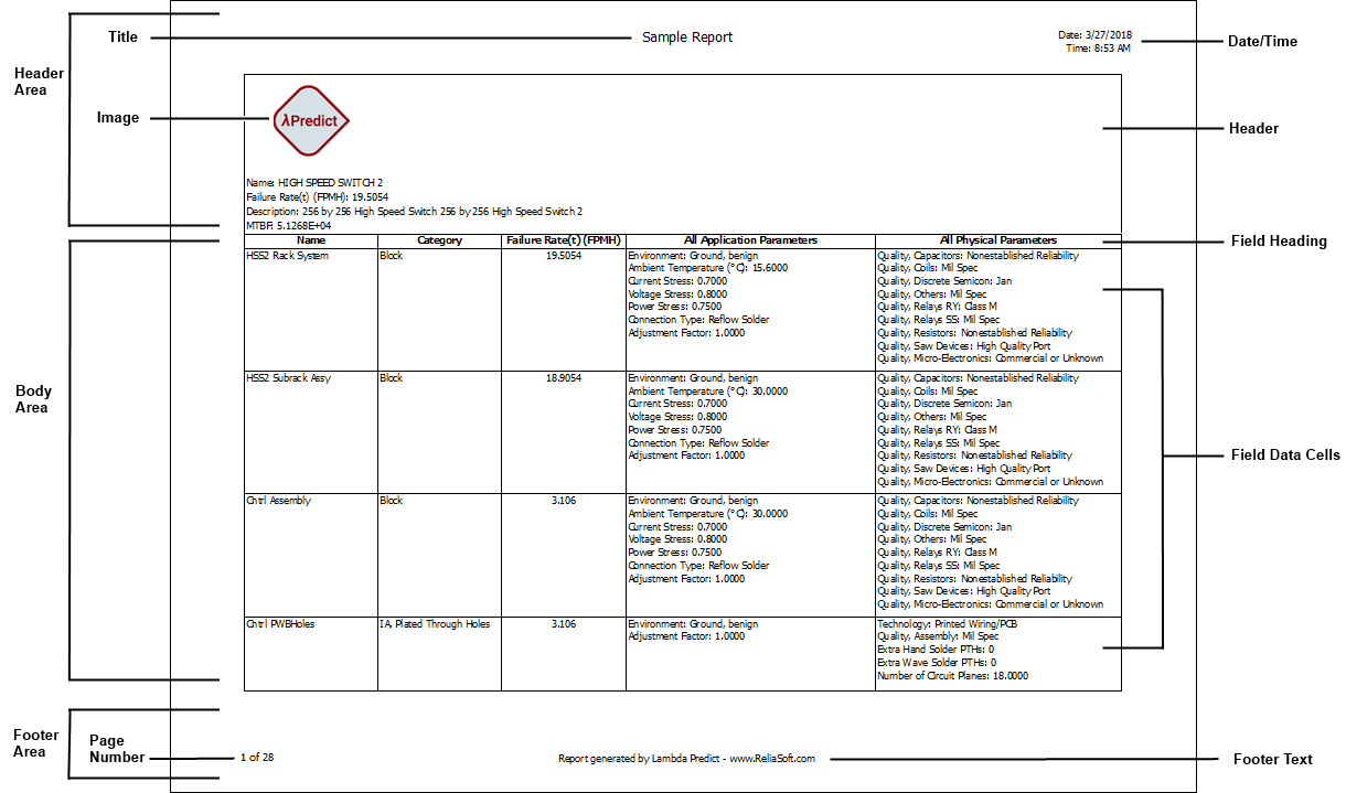 The report templates are saved as *.lp19r files and are always associated with a particular reliability prediction standard (e.g., a template created for the MIL-217 standard cannot be used to generate a report for a Telcordia analysis). To use the templates to generate or publish a report, see Lambda Predict Reports.