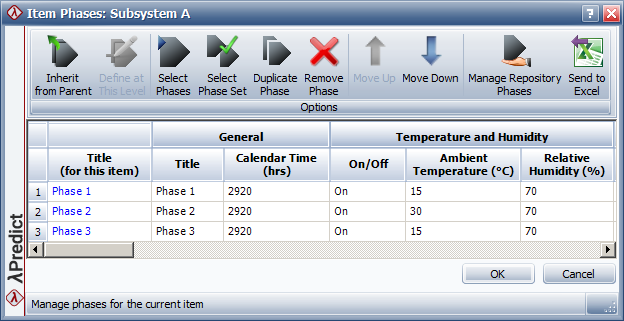 To access the Item Phases window, select an item in the system hierarchy and then choose Prediction > FIDES > Item Phases.