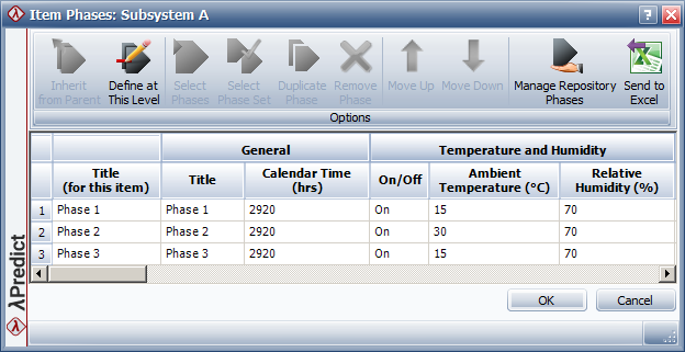 For any FIDES analysis, you will be able to specify different phases that a system or assembly experiences during operation (i.e., define the item's life profile). Some of the component properties (such as applied voltage or power dissipated) can then be defined separately for different phases. The phases themselves also have various properties that will affect the failure rate calculations (such as ambient temperature and environmental pollution).