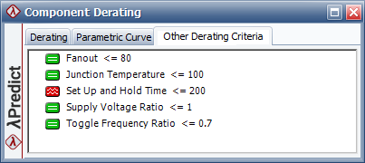 The following example shows the derating requirements of one particular component. In this case, the "Set Up and Hold Time" property of the component exceeds the derating requirement, which is less than or equal to 200 minutes. Therefore, that criteria shows a red icon next to it, indicating that the component is overstressed.