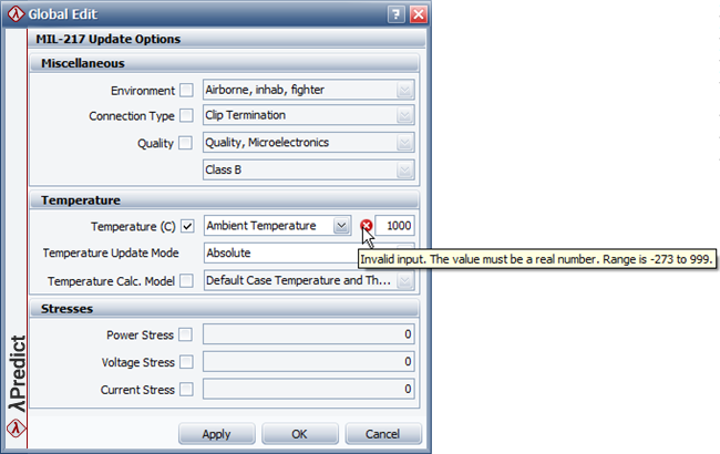 Global edit does not affect properties that have been automatically calculated by Lambda Predict. For example, the value of a capacitor's "Voltage Stress" property can either be automatically calculated (from its Rated Voltage and Applied Voltage properties) or entered directly into the field (by setting both the Rated Voltage and Applied Voltage properties to zero). If the capacitor's "Voltage Stress" property contains a calculated value, then any changes made to the same property in the Global Edit window will not affect that calculated value.
