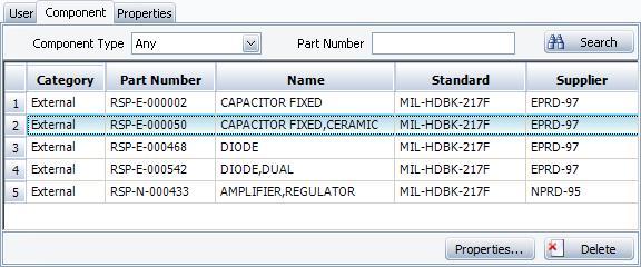 To view or edit the properties of a component that already exists in a library file, click the Component tab in the Manage Library window. Use the Component Type and/or Part Number search criteria to find the component you wish to edit, and then click the Search button, as shown in the following example.
