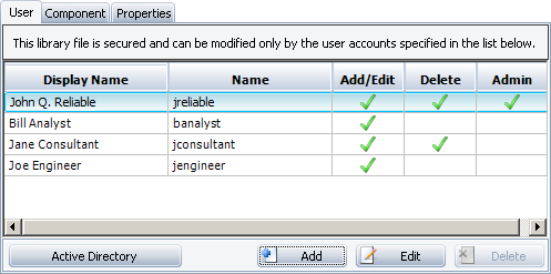 When you enable security, the User tab, which shows the list of authorized users for the library file, will be available, as shown in the following example.