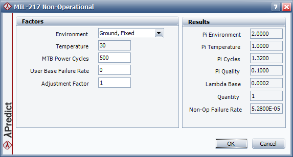 Adjustment Factor allows you to tweak an item's calculated non-operating failure rate by a specified value. For example, if you have reason to believe that the non-operating failure rate of a component will be half of the rate calculated by the application, change the adjustment factor from 1 (the default) to 0.5. If you expect that the failure rate will be twice what would be calculated by the application, change it to 2, and so on. Assuming that the calculated non-operating failure rate is 0.1544, the software would display 0.0772 with an adjustment factor of 0.05, or 0.3087 with an adjustment factor of 2.