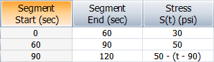 For example, suppose you are creating a stress profile where the stress unit is psi and the time unit is seconds. Now suppose you wanted to define the following 120-second pattern: a stress value of 30 psi for 60 seconds, followed by a stress value of 50 psi for 30 seconds, followed by a stress function that begins at 50 psi and gradually decreases at a rate of 1 psi per second for the remainder of the pattern. For this pattern, you could fill out the spreadsheet as follows: