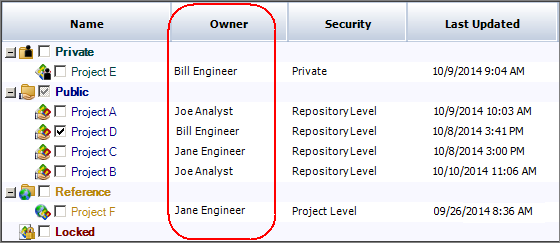 The Manage Projects window (Project > Management > Manage Projects) displays a list of all projects and their owners in a table format. You can use custom filters to filter, sort and/or group the list based on the project owner.