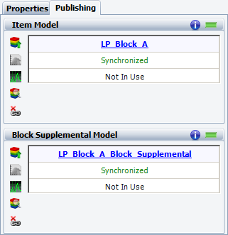 Note that for blocks, the Publish Branch command publishes both an item model (which reflects the failure rate predicted for the entire assembly) and a supplemental model (if applicable). The following example shows the Publishing tab of a block that has both its item model and supplemental model published.