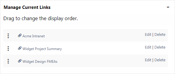 In the Manage Current Links section, change display order, edit the link name or delete the link. For online links, you can also edit the URL.